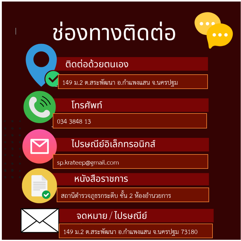 สถานีตำรวจภูธรกระตีบ 149 หมู่ 2 ต.สระพัฒนา อ.กำแพงแสน จ.นครปฐม 73180