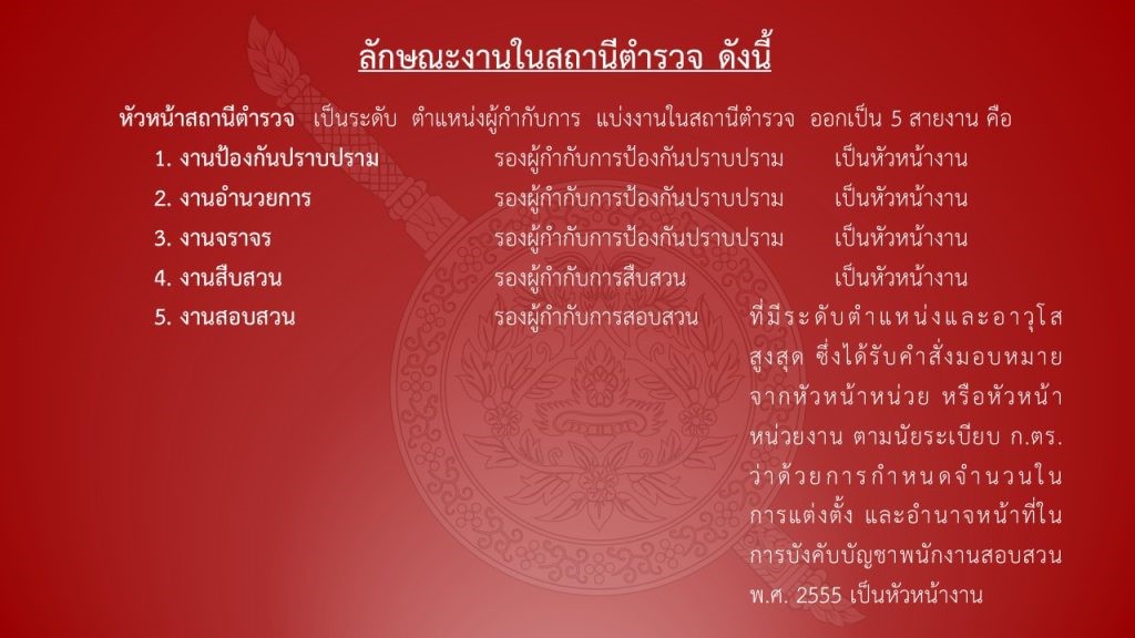 - ปฏิบัติการอื่นใดตามที่กฎหมายกำหนดให้เป็นหน้าที่ของตำรวจหรือสำนักงานตำรวจแห่งชาติ